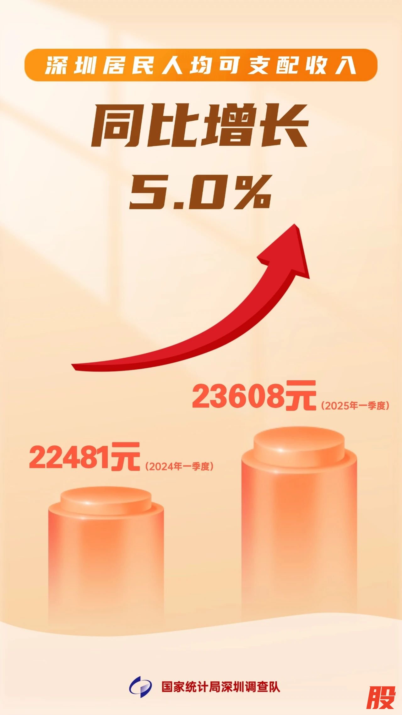 4月25日,据国家统计局深圳调查队发布的数据,2025年一季度,深圳居民人均可支配收入23608元,同比增长5.0%。