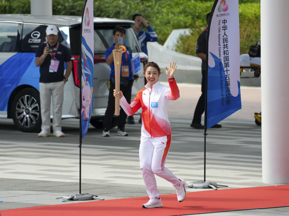 ↑ 火炬手巩立姣在火炬传递活动中。新华社记者 黄伟 摄