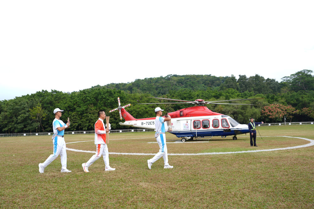 ↑ 火炬手兰小军(左二)手持火炬向直升机走去,他将进行空中传递。新华社记者 江汉 摄
