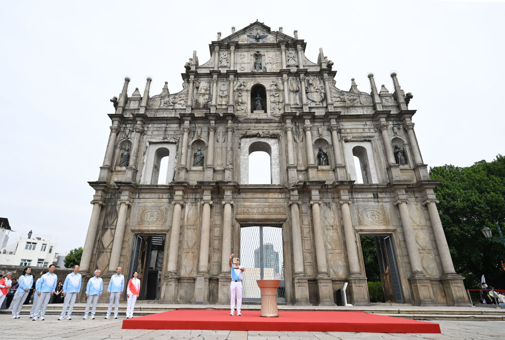 ↑ 火炬手罗协铭在大三巴牌坊前进行火炬传递。新华社发(张金加摄)