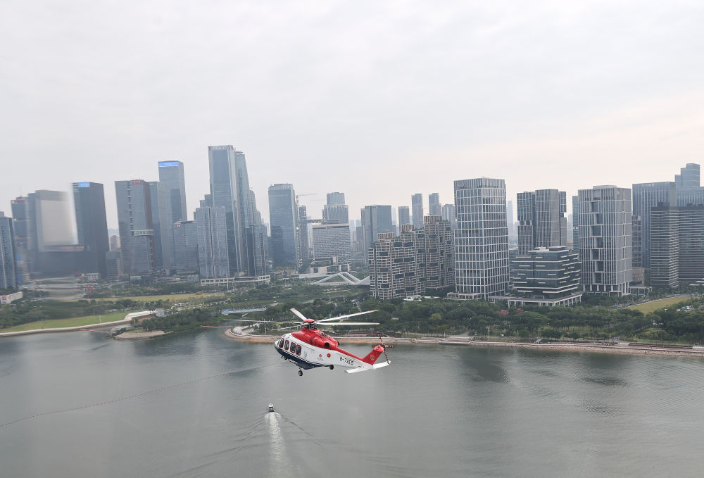 ↑ 搭载圣火的直升机进行空中传递。新华社记者 梁旭 摄