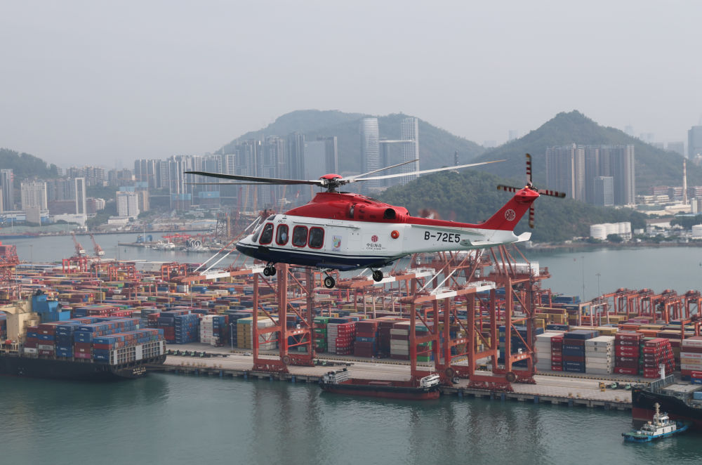 ↑ 搭载圣火的直升机进行空中传递。新华社记者 江汉 摄