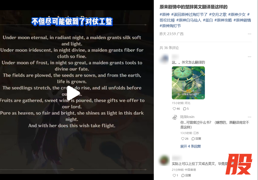 如何向外国玩家翻译、解释?在社交媒体上,玩家们自发为这首诗歌的生僻字标注拼音,对全诗进行考据,并戏称是“和派蒙(《原神》角色)一起补习语文”。