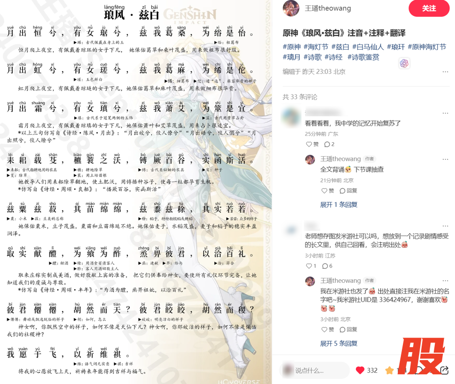 “第一时间给出通俗的解释,同时不失深度与美感。”有网友评价,“《原神》的做法其实也给了当代文化工作者一个启发:通晓古今,雅俗并重,为传统诗词赋予时代内涵,创作出大众喜闻乐见的作品。”