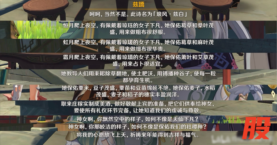 剧情中出现的诗歌《琅风·兹白》,是琅玕国人民颂咏白马仙人的民歌,表达对仙人的赞美,寄托对美好生活的期许。为帮助玩家更好地理解诗歌的文化意蕴,游戏中,兹白灵魂的其中一缕“兹蹻”带来了“权威”翻译。