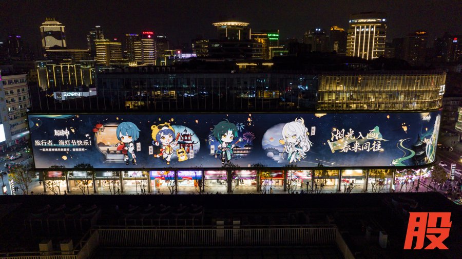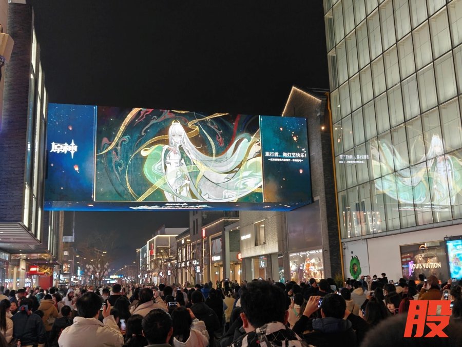 西湖边西子廊桥大屏幕下,玩家与游客共同观赏《原神》海灯节宣传片